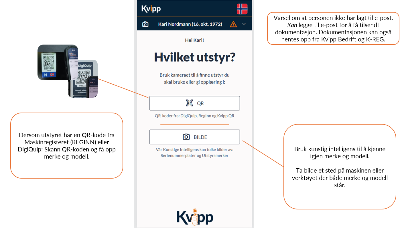 2.QR-kode: Når du skanner QR-kode fra DigiQuip, BRAREG eller REGINN/Maskinregisteret, finner Kvipp merke og modell.