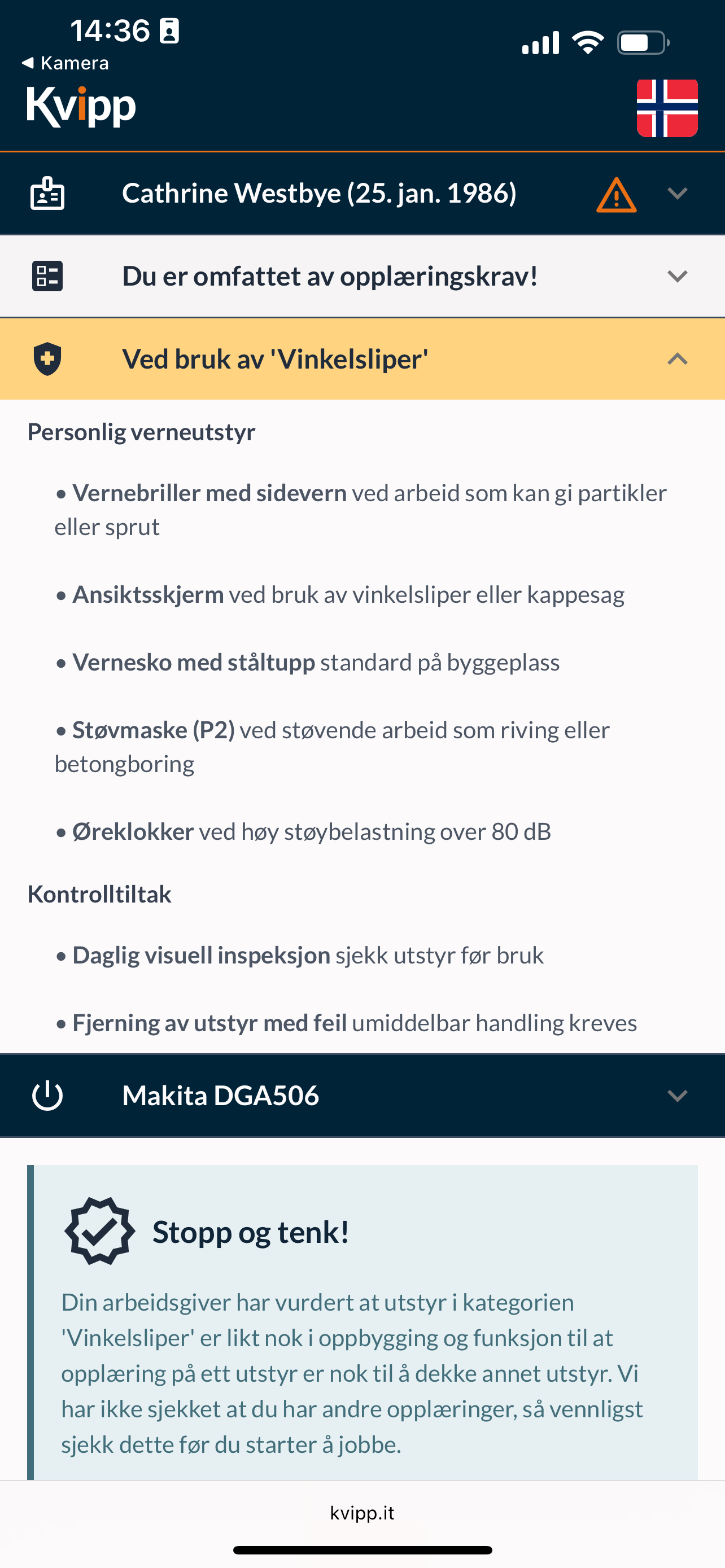 I tillegg til tydeliggjøring av opplæringskrav, kan du definere hvilke forholdsregler som skal tas når utstyret brukes. Gå gjennom disse forholdsreglene under opplæring.I tillegg blir forholdsreglene synlige ute i Kvipp for den det gjelder.