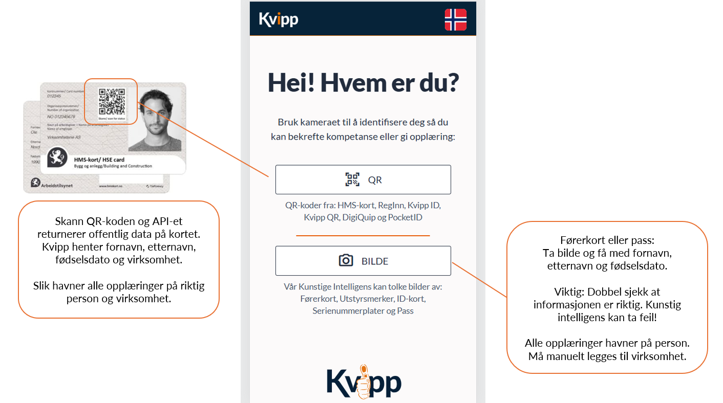 I stedet for innlogging, bruker vi HMS-kort og annen ID (førerkort, pass) som identifisering. Med dette er det ikke nødvendig å legge til brukere eller opprette konto for å bruke Kvipp.